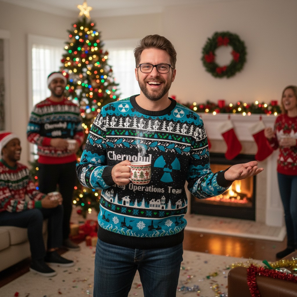 The holidays are officially upon us, which means it's time to trade serious sweaters for something far more powerful — satire-level festive fashion. If you love history, science, and the kind of gallows humor that only true geeks appreciate, this year’s hottest (radioactive, even) holiday drop is calling your name: the Chernobyl 1986 Ugly Christmas Fuzzy Fleece Sweatshirt, now available at GeeksOutfit.com.