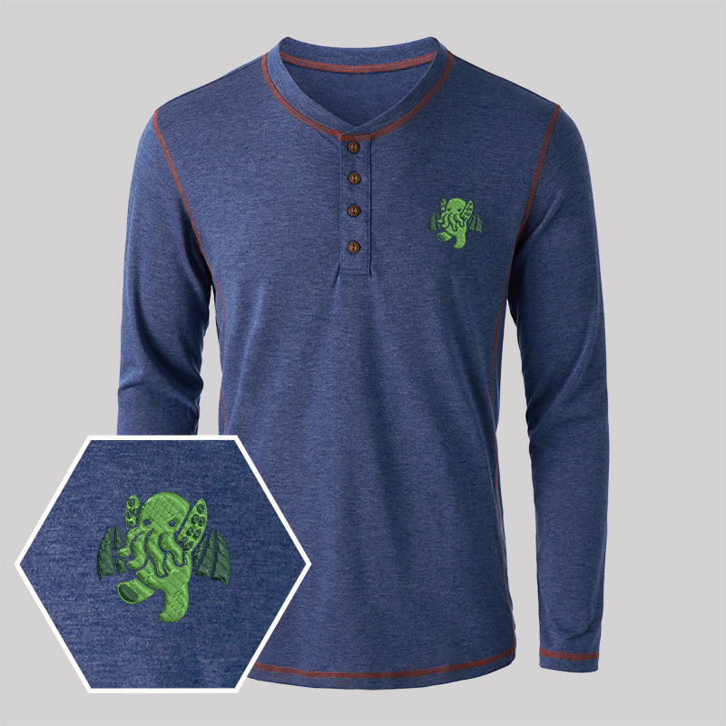 Cthulhu Geek Embroidered Long Sleeve Henley Shirts