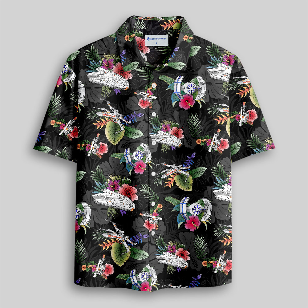 Space Fighter Tropical Flowers Button Up Pocket Shirt